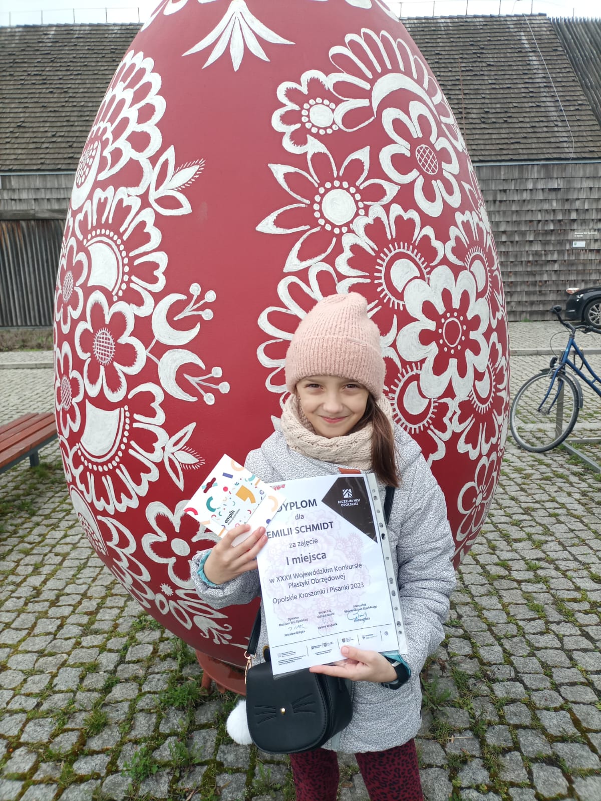 Po raz kolejny talent Emilki został zauważony i doceniony. Uczennica klasy drugiej zajęła 1 miejsce w XXXII Wojewódzkim Konkursie Plastyki Obrzędowej “Opolskie Kroszonki i Pisanki 2023” w Bierkowicach.