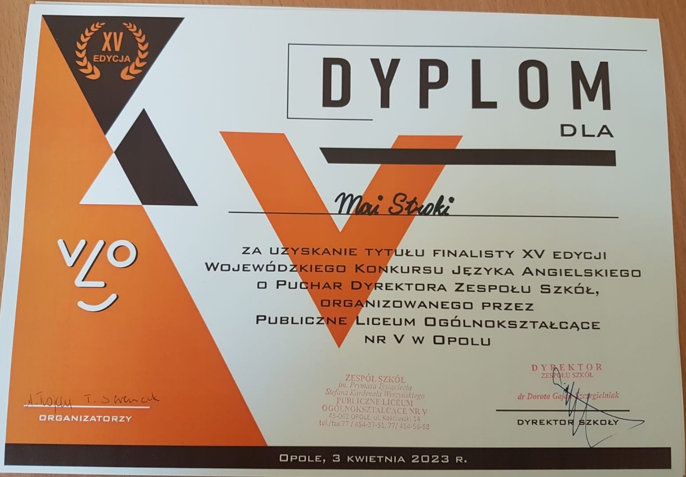 3 kwietnia 2023r. odbył się 15 Finał Wojewódzkiego Konkursu Języka Angielskiego o Puchar Dyrektora Zespołu Szkół, w którym wzięło udział 43 uczniów. Nasza szkołę reprezentowała Maja Stroka, która wykazała się bardzo wysokimi umiejętnościami językowymi; zdobyła piąty wynik i została finalistką tego konkursu.SERDECZNIE GRATULUJEMY!
