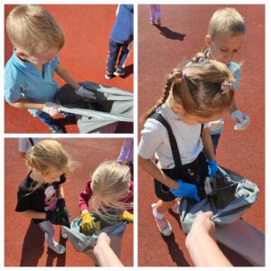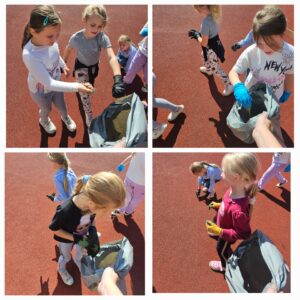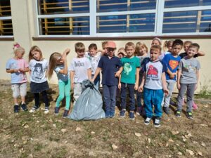 Z tej okazji uczniowie klas 1 i 4 przygotowali krótkie przedstawienie, w którym przypomnieli nam o prawidłowej segregacji śmieci i ochronie środowiska. Następnie wszyscy uczniowie, z pełnym zaangażowaniem, wyruszyli w wyznaczone miejsca wokół szkoły, by wspólnie zadbać o naszą okolicę.