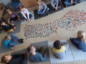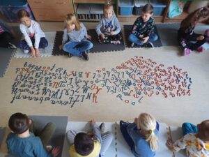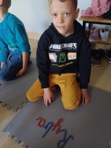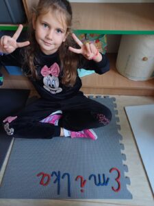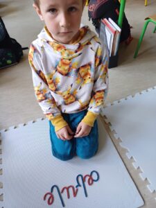 Utrwalając litery warto korzystać z różnych sposobów – dziś spośród liter alfabetu wyszukiwaliśmy poznane samogłoski oraz pisaliśmy wybrane wyrazy.