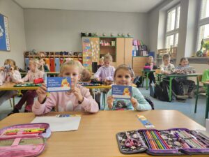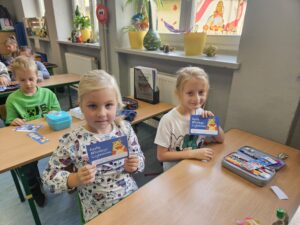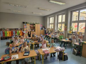 Klasa 1a z radością bierze udział w wyjątkowym programie promującym czytelnictwo wśród najmłodszych – „Czytam Sobie z Radością”. Dzięki temu uczniowie zyskali własną klasową biblioteczkę, pełną ciekawych książek dostosowanych do ich poziomu wiekowego i zainteresowań. W ramach programu każde dziecko otrzymało Kartę Młodego Czytelnika, która dodaje im motywacji do sięgania po kolejne lektury.
