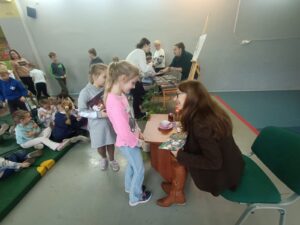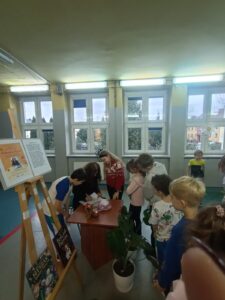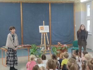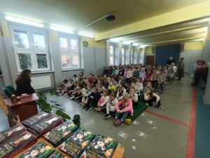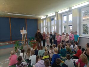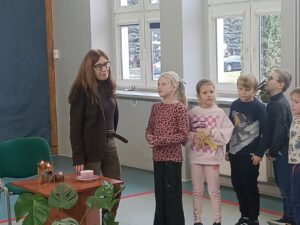28 listopada 2024 w naszej szkole odbyło się spotkanie autorskie z p. Katarzyną Ryrych. Słuchaczami pisarki, poetki oraz malarki byli uczniowie klas 1-3. Autorka odpowiedziała dzieciom o swojej twórczości, a także przedstawiła krótkie historie zwierząt. Po spotkaniu była możliwość zakupienia książek autorki. Do Pani Katarzyny Ryrych ustawiła się długa kolejka po dedykacje i autografy.
