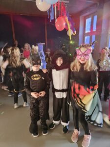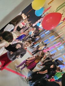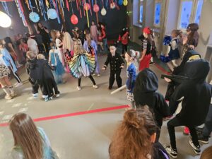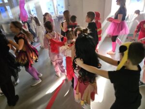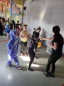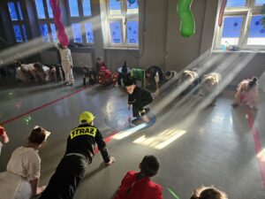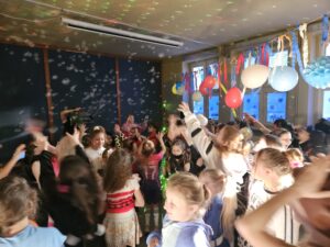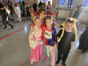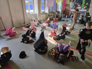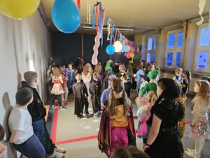 Sala gimnastyczna została pięknie udekorowana kolorowymi balonami, serpentynami oraz migoczącymi girlandami, co stworzyło prawdziwie magiczną atmosferę. Uczniowie przybyli na bal w fantastycznych strojach – można było zobaczyć księżniczki, rycerzy, superbohaterów, zwierzątka oraz wiele innych bajkowych postaci.