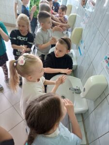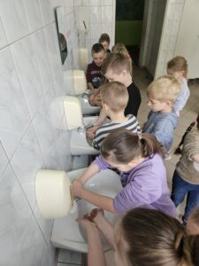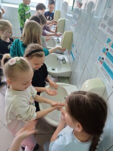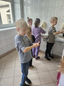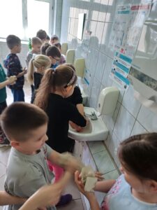7 kwietnia – Poniedziałek rozpoczęliśmy od przypomnienia, jak ważna jest higiena rąk – to kluczowy element w zapobieganiu rozprzestrzenianiu się infekcji. Poprawne mycie rąk to prosta, ale bardzo skuteczna metoda ochrony przed wieloma chorobami zakaźnymi. Wolontariuszki ze starszych klas przygotowały dla młodszych uczniów pokaz prawidłowego mycia rąk oraz udzieliły praktycznych wskazówek, jak często powinniśmy to robić w ciągu dnia.