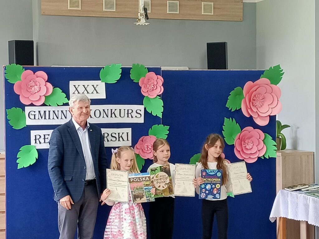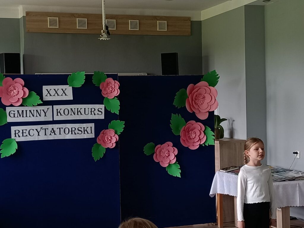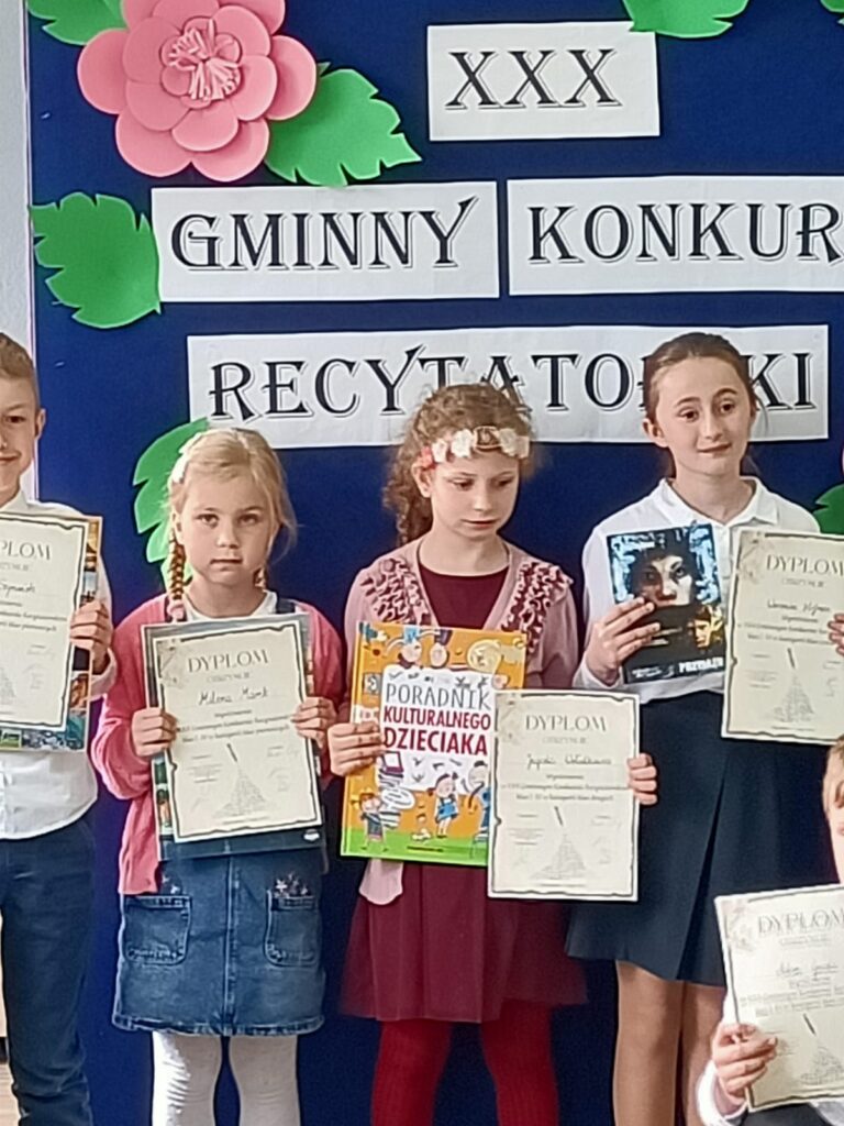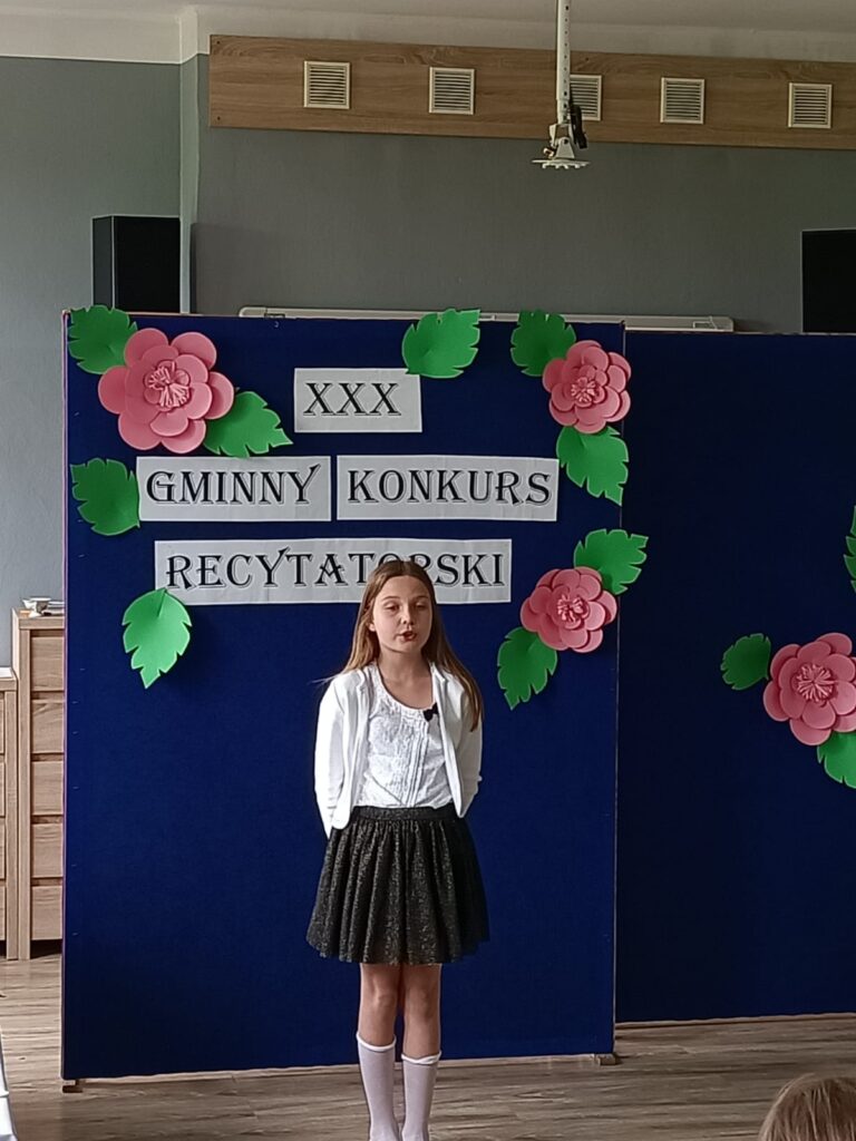 7 maja odbył się XXX Gminny Konkurs Recytatorski klas 1-4. Naszą szkołę reprezentowały uczennice: Milena, Maja, Nadia, Magda i Hania. Wszystkie dziewczyny pięknie recytowały przygotowane wiersze. Wyniki konkursu przedstawiają się następująco: