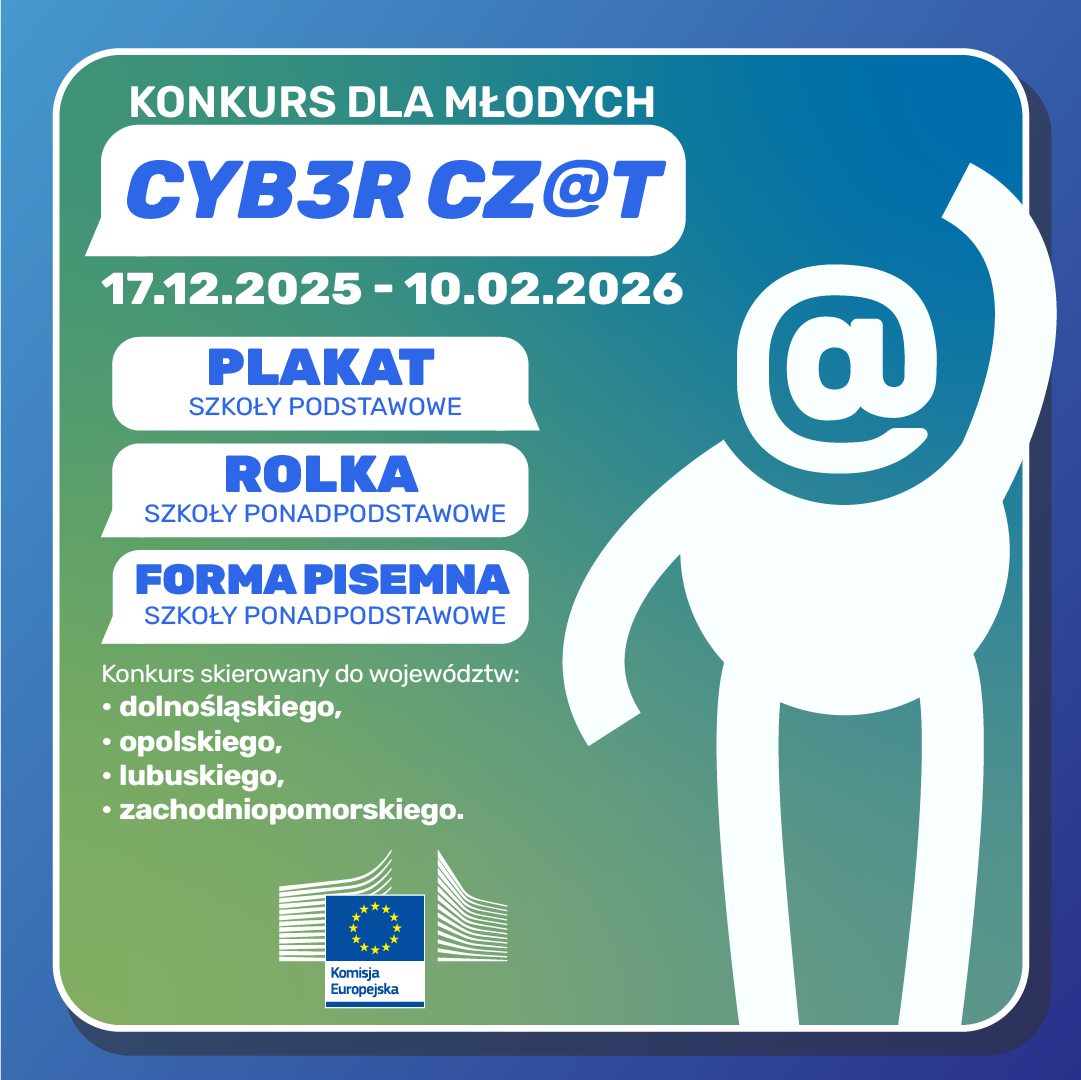 CYBER CZAT to element szerszych działań edukacyjnych Unii Europejskiej na rzecz wzmacniania kompetencji cyfrowych, higieny cyfrowej oraz bezpieczeństwa dzieci i młodzieży w sieci, realizowanych m.in. w ramach strategii BIK+ – Lepszy Internet dla Dzieci.Więcej informacji: https://poland.representation.ec.europa.eu/events/konkurs-cyber-czat-2026-2025-12-17_pl Konkurs ma charakter kreatywny, uczniowie mogą zgłaszać prace w następujących formach: plakat (szkoły podstawowe). Na laureatów czekają atrakcyjne nagrody…