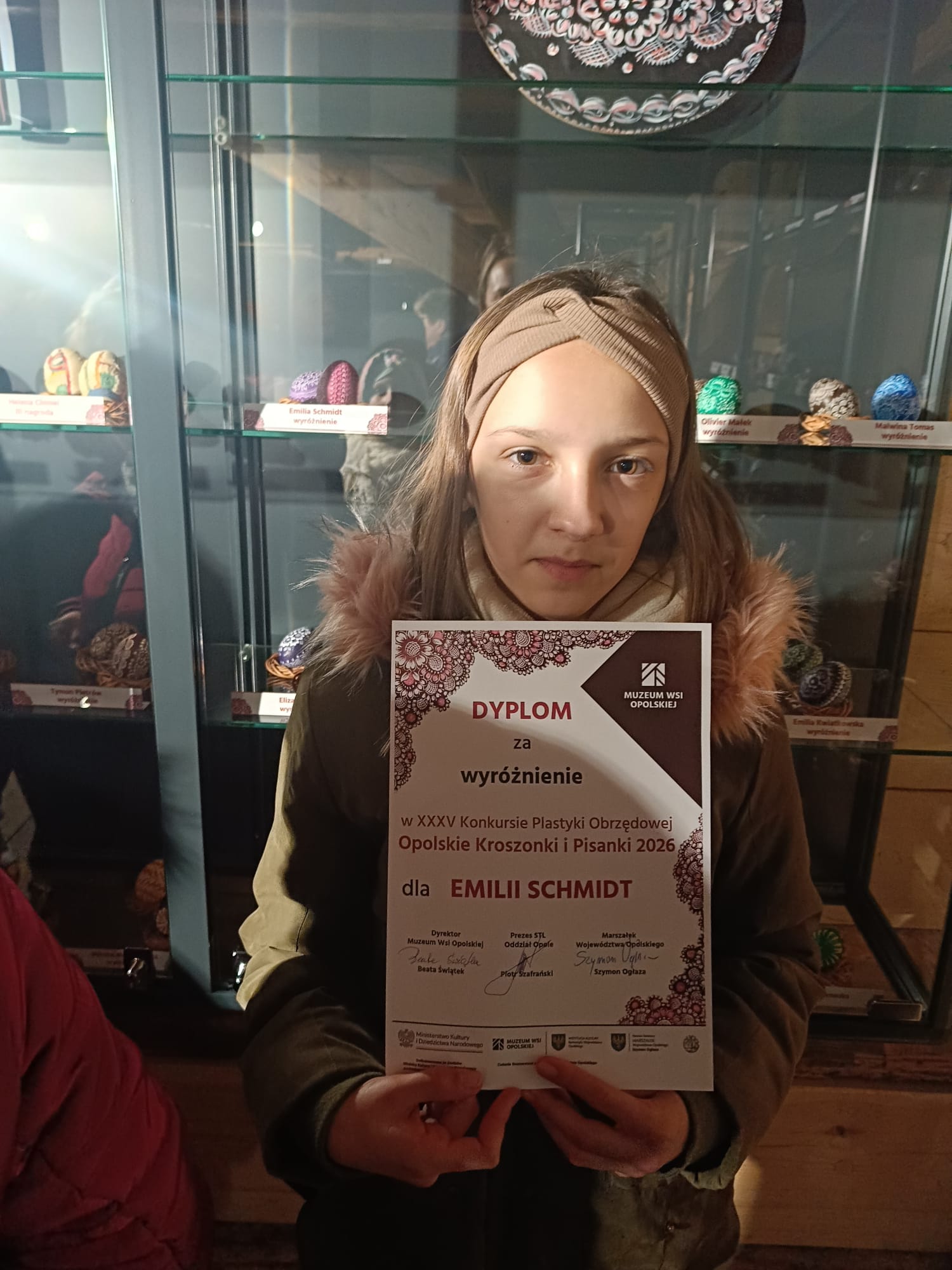 Nasza uczennica Emilia Schmidt zdobyła wyróżnienie w XXXV Konkursie Plastyki Obrzędowej Opolskie Kroszonki i Pisanki 2026, organizowanym przez Muzeum Wsi Opolskiej. W tegorocznej edycji udział wzięło aż 188 uczniów, dlatego to osiągnięcie jest szczególnie cenne i napawa nas ogromną dumą. Wystawę pokonkursową można zwiedzać w zabytkowym spichlerzu z Grudyni Małej. Serdecznie gratulujemy Emilce talentu!